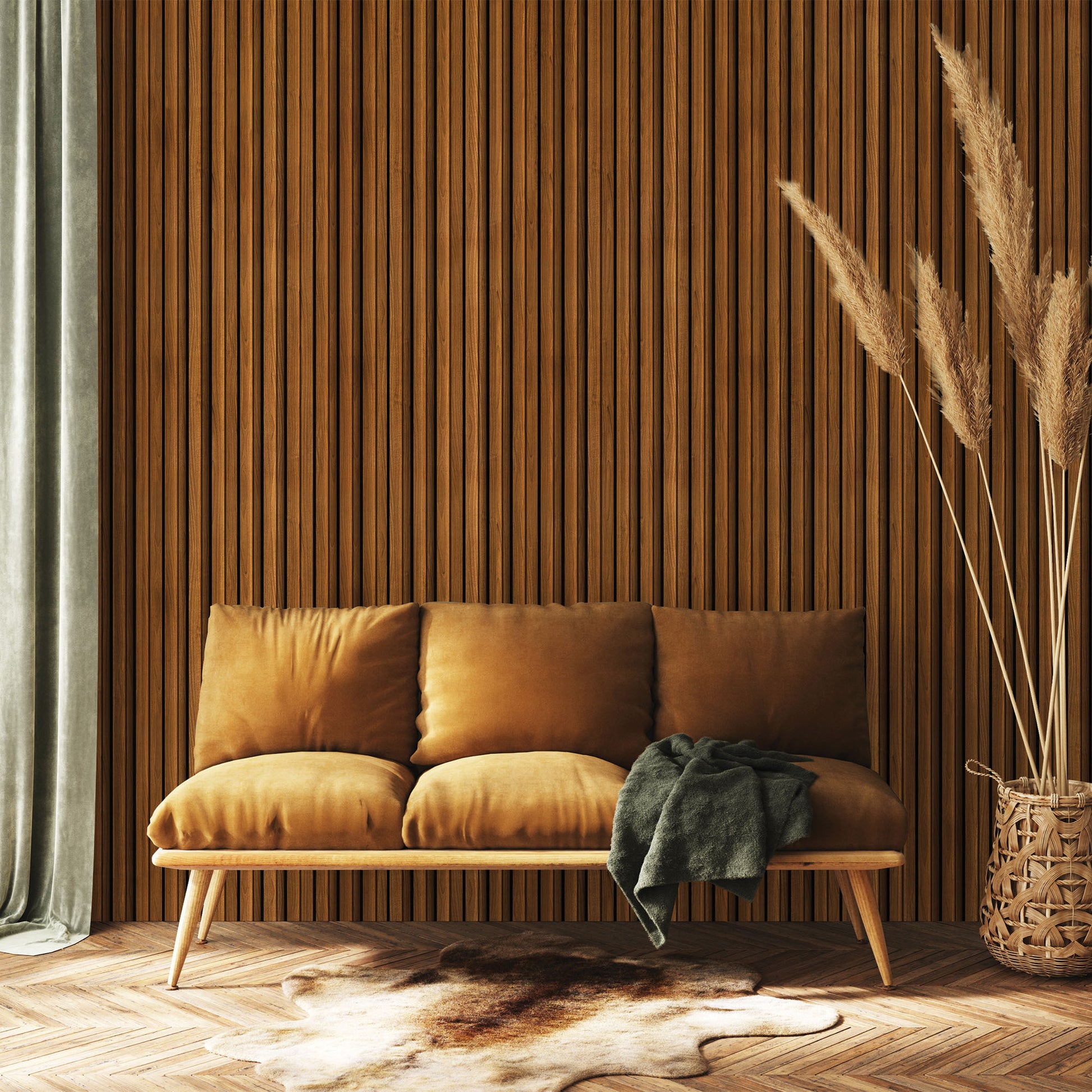 Elegant grooved MDF wall panel in brown, imitating wood.