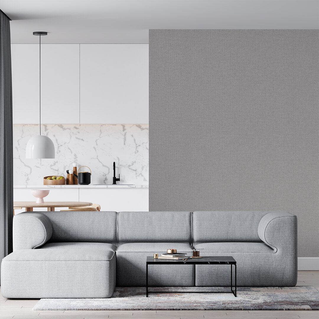 Subtelna tapeta ze wzorem strukturalnym inspirowanym fakturą tkaniny w odcieniu szarym.