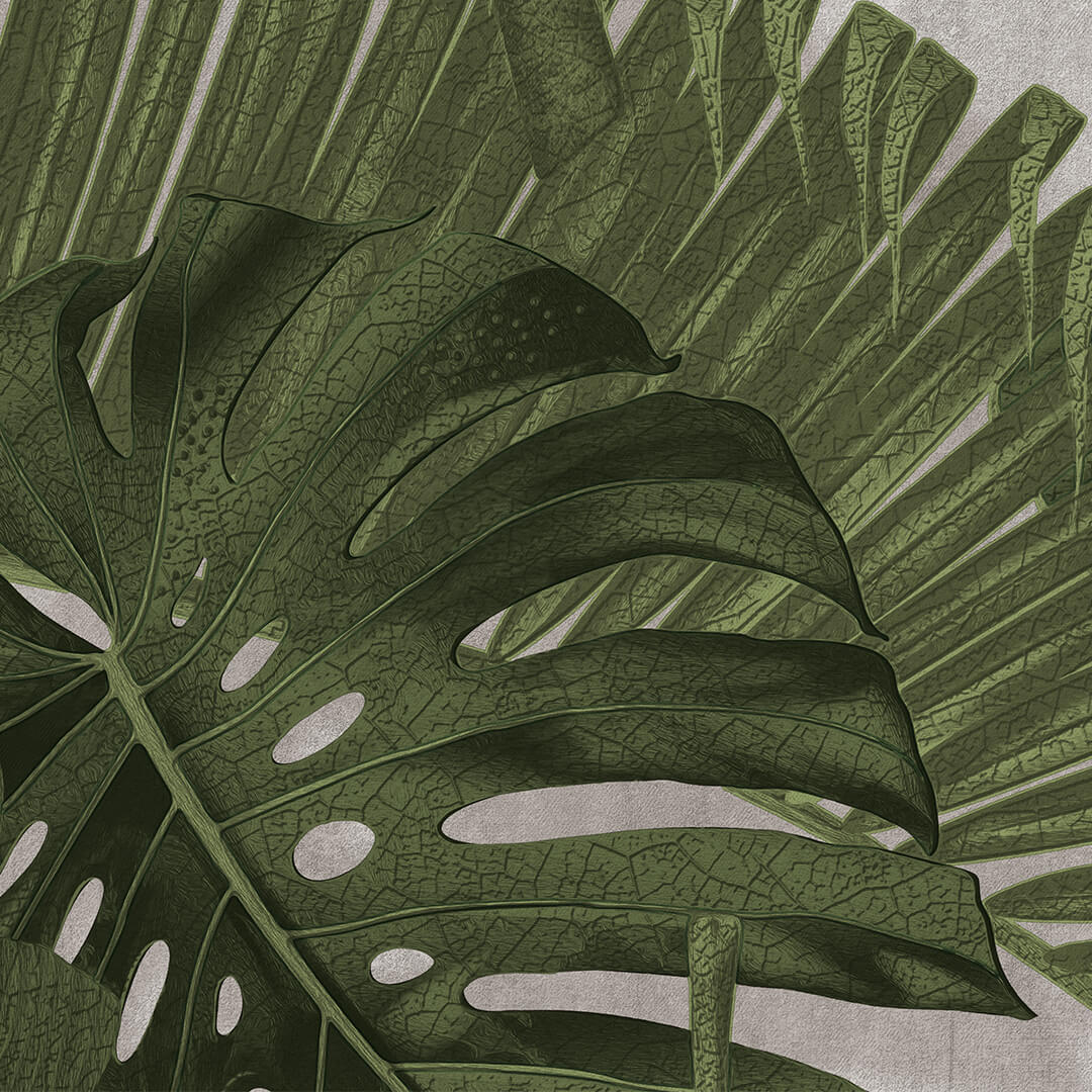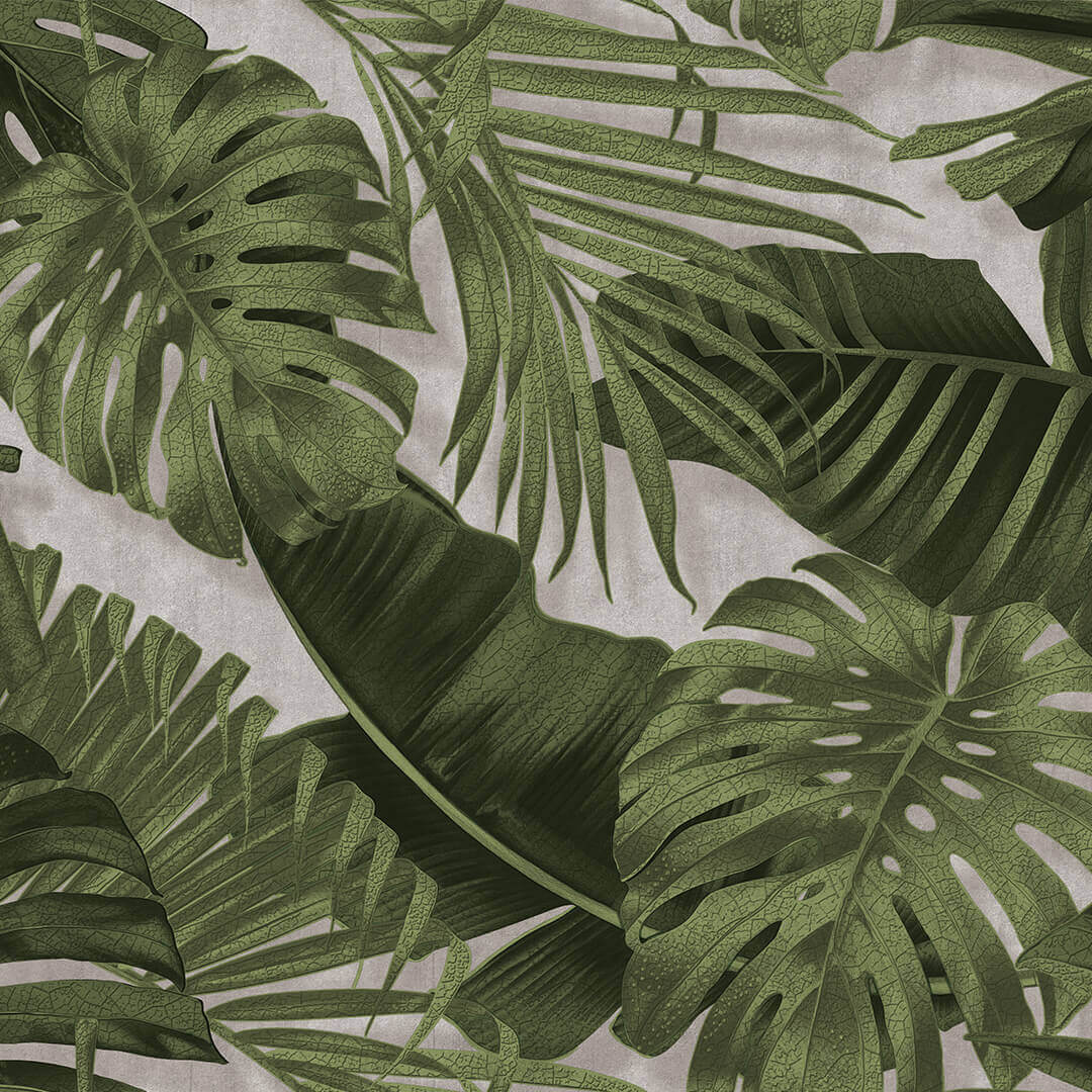 Tapeta ze wzorem w duże liście palmowe w odcieniu bieli i zieleni.