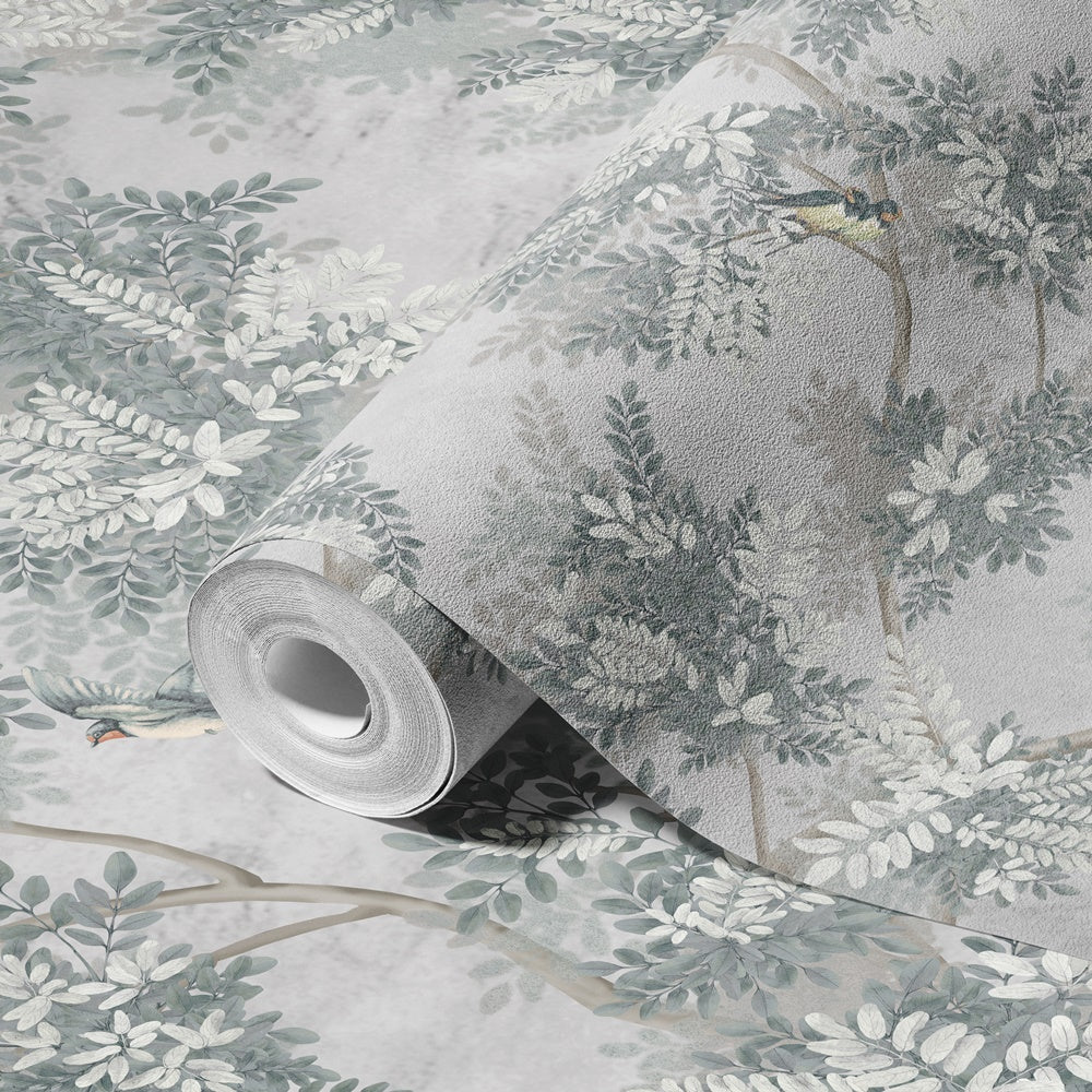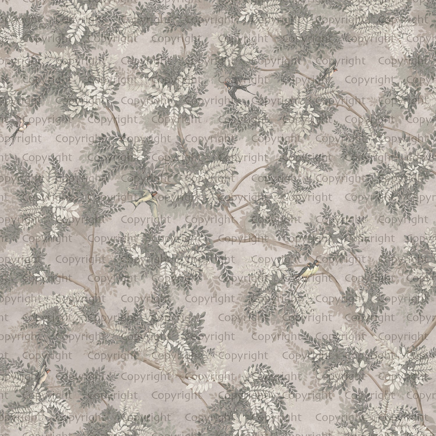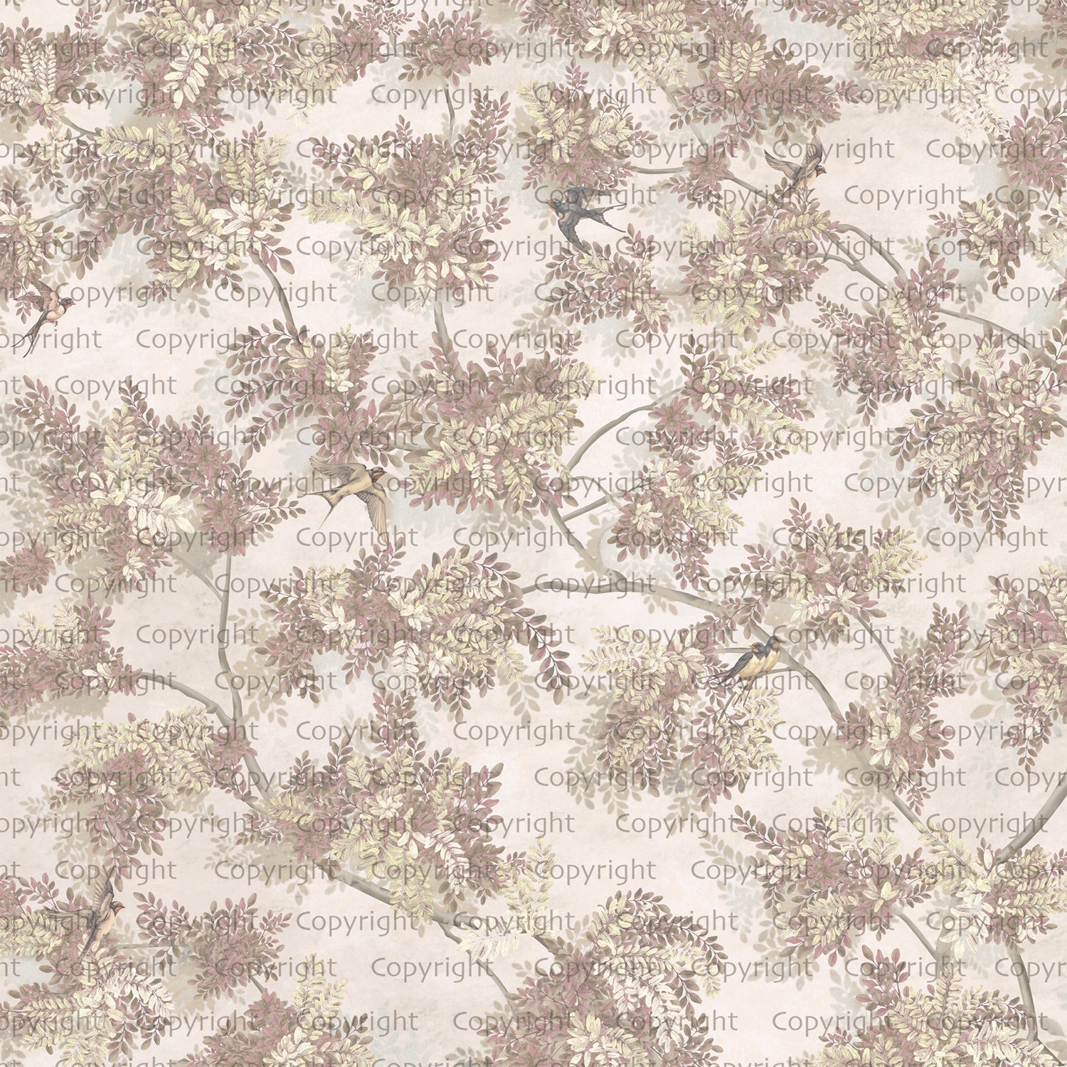 - wzór krzewów/ drzew z wystepującymi niewielkimi ptakami