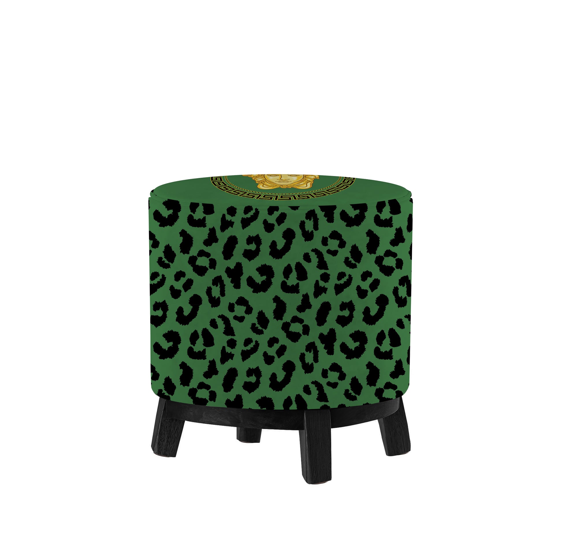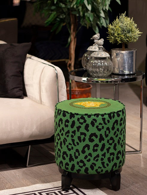 Stabilna pufa w kolorze zielonym w czarną panterkę, z motywem greckim na siedzisku, na czarnych drewnianych nóżkach. Szeroka i stabilna gąbką pozwala na korzystanie z pufy jako stoliczka.