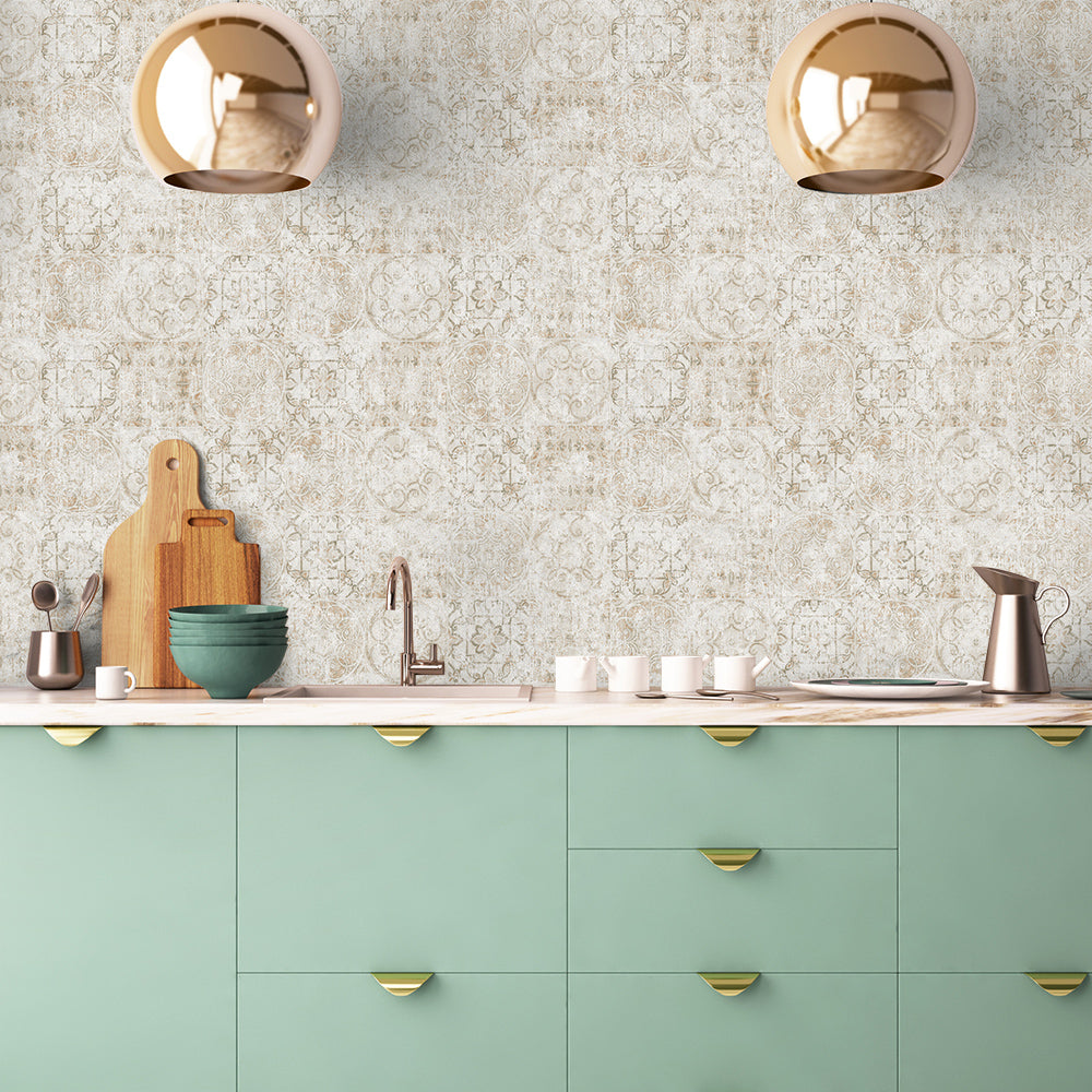 Trwała, mocna winylowa tapeta, która doda przytulności i uatrakcyjni każde pomieszczenie. Aksamitne, satynowe wykończenie winylu z delikatną strukturą odczuwalną w dotyku. Imitacja płytek, moizaika, przetarcia.