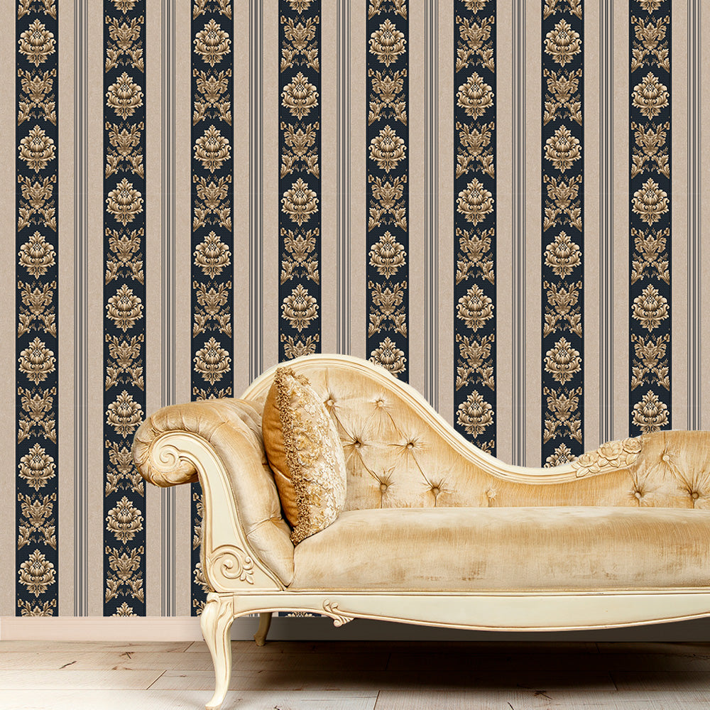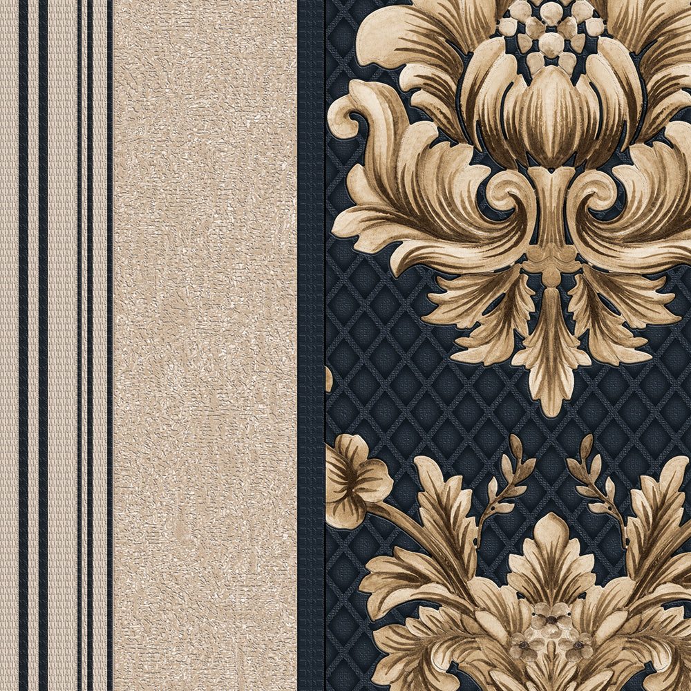Trwała, mocna winylowa tapeta, która doda przytulności i uatrakcyjni każde pomieszczenie. Aksamitne, satynowe wykończenie winylu z delikatną strukturą odczuwalną w dotyku. Ornament "lwi kwiat" na grafitowym tle w pasach.